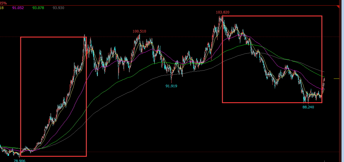 图上,红色矩形框,都是美元指数一个周年跨度的周期,基本上可以看出是单边的,但是,你去统计就能发现,在这两个周期中,非农的数据所谓的利好利空分布基本上均衡的。这显然表达了这样一个基本的事实,数据最终被趋势统计了。也就是说,如果是涨势,就算非农数据本身在我们的定义中可能是利空或利好,但很显然市场已经由一些其他的因素给综合了,也就是行情走势是综合因素表达的结果,一个延迟性的非农书报告正常的处理方式,应该是尊重这种综合性的表达。而不是断章取义或那个局部性的非农数据把已有的事实给概括了。就如上文所述,把一个医学报告,可能有很多项指标,但最后的综合结果表明你是健康的,那就是健康的,而不能因为某项指标的偏差,就说病的不行了,如果是这样,你将发现,健康的人,应该是没几个的或者说根本就没有。其次,所谓的好和不好,不是一个单纯的非此即彼的质的度衡,其也是一个量变和质变的关系,就如饿了吃饭这样再正常不过的事情,也可能吃多了会撑死。所以我们要学会在尊重走势本身的的高度上去理解数据,否则也就只能是盲人摸象般贻笑大方了。理解了这个层次,你将发现,非农之类数据行情,有一种很好的处理方法,就是在历史中去处理,在历史中,在走势中,所谓的数据也往往只是一个美丽的涟漪罢了,并没有太多实际的意义。