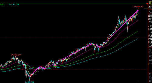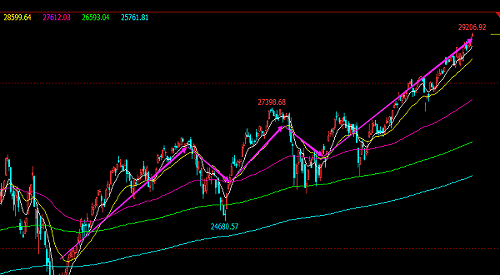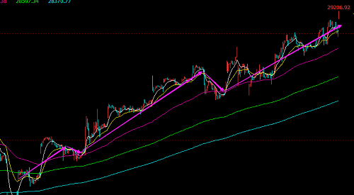 而我们站在日线的角度,道琼斯指数同样摆脱了第一卖点的限制,也是一个长的上涨段。而站在29000点附近,看道琼斯指数30分钟走势,也是一个标准的难论走势,目前正处在第五段的延续过程中,且也即将摆脱第一卖点约束。如此来看,道琼斯这个走势是真的猛烈。可是也正因为走势如此地规范,给了我们在常规下去把握其发展的可能。