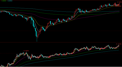 最近在给学生们讲解行情的时候,一般都会说到澳元兑美元的当下操作,因为这是一个难得的当下案例。由于外汇波动的相对稳定性,平时要见到这般流畅而高远的日线段,确实很难。可是也正因为不常见,故而就算按照体系完全可以处理,心理也难免会有心结:要么不敢下手,要么止不住空一大把的冲动。