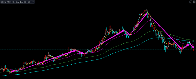 实际上,“被动调整+主动调整”的组合进程,难者已经在多篇博文中有反复提及,只是随着行情的发展,这个逻辑在不断展开而已。上图是A50指数的4小时走势,其有着标准的难论结构。七段趋势背驰,意味着这段下跌,在结构意义上本就是很正常的事情。而同样在结构意义上,目前则容易发展出一个难论极限背驰4小时第一买点。这就是为何一开始说A50指数看似下跌较多,其实也是一种抗跌表现的原因所在。